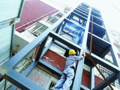 工程于今年4月29日开工。新增电梯承重结构为钢框架,外围护结构为玻璃幕墙。电梯除首层起始停站外,上部共停四站,分别为2层半、3层半、4层半、5层半楼梯休息平台处。