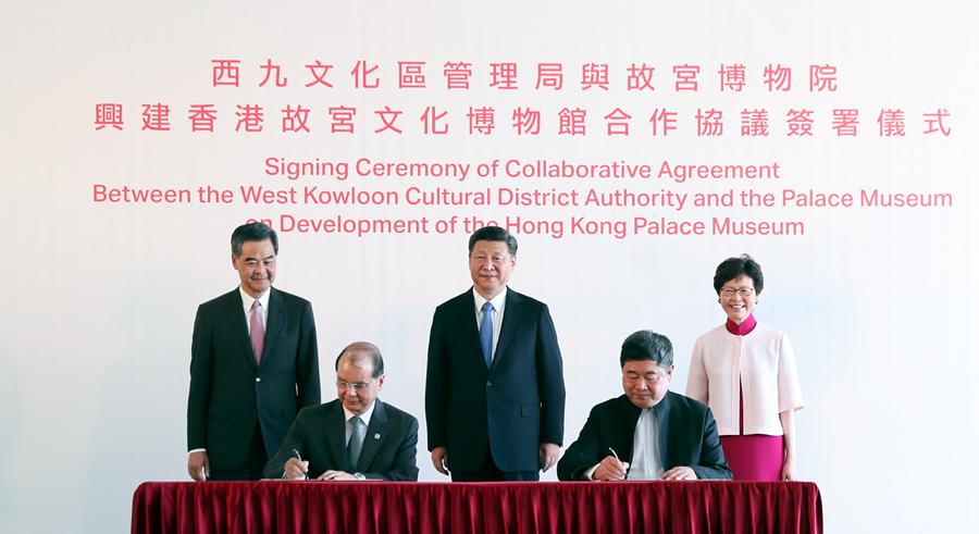 在香港特别行政区行政长官梁振英、候任行政长官林郑月娥陪同下,习近平见证了香港特区政府政务司司长兼西九文化区管理局董事局主席张建宗与故宫博物院院长单霁翔签署《兴建香港故宫文化博物馆合作协议》。