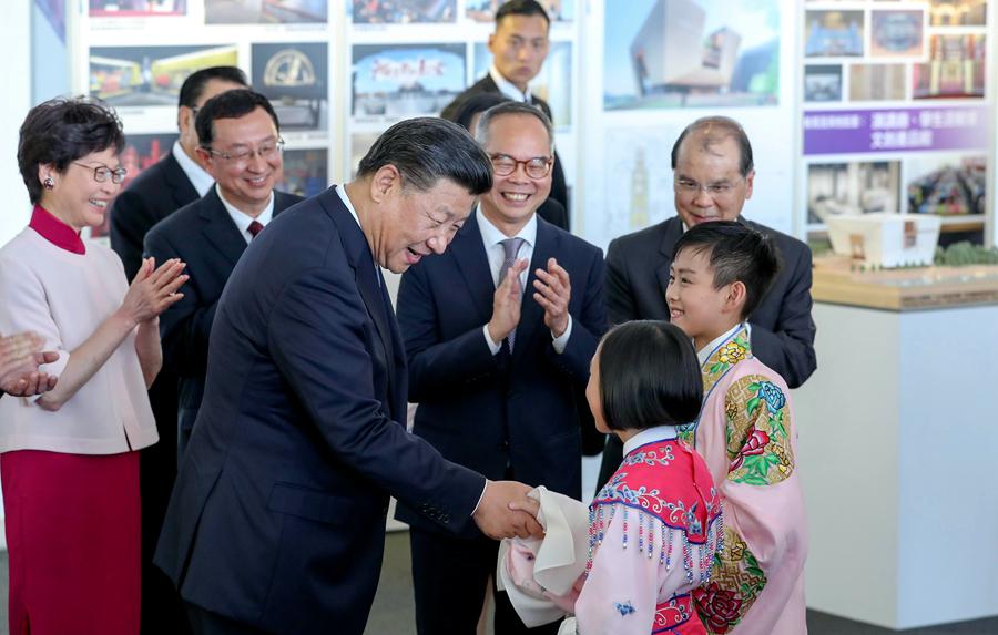 6月29日下午,国家主席习近平在香港西九文化区出席《兴建香港故宫文化博物馆合作协议》签署仪式。这是习近平同现场演唱粤剧选段的两名儿童亲切交谈。