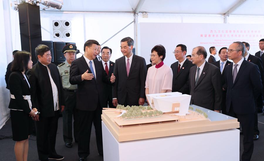 习近平十分关心香港文化艺术发展,在签署仪式前听取了西九文化区规划和香港故宫文化博物馆选址建设等情况的介绍。他表示,西九文化区项目是几届特别行政区政府接力推进的一项重点工程,它的建成将为广大香港市民提供一个方便舒适的文化娱乐场所,也有利于促进香港文化创意产业发展,还将丰富香港国际都会的文化内涵,增加中西合璧的城市文化魅力。希望香港弘扬中华优秀传统文化,发挥中西文化交流平台的作用,推动同内地的文化交流合作。