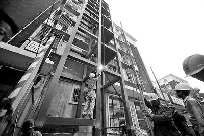 去年11月以来,社区多次召开居民代表、党员代表大会,把加装电梯的事定了下来,到今年3月初,加装电梯居民支持率超过了90%,按相关政策可以进入施工阶段。在现状六层砌体结构住宅楼的楼梯间外侧附建新增的电梯,新增电梯承重结构为钢框架,外围护结构为玻璃幕墙。电梯除首层起始停站外,上部共停4站,分别为2层半、3层半、4层半和5层半楼梯休息平台处,工程在4月29日开工,将于8月31日竣工。