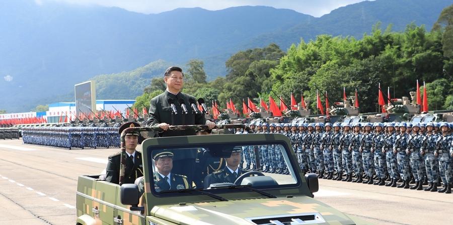 军乐队奏响雄壮的阅兵曲。习近平乘车依次检阅驻香港部队20个方队。3100余名受阅官兵军容严整、意气风发,防空导弹、轮式装甲车、武装直升机等武器装备整齐列阵、威风凛凛。“同志们好!”“主席好!”“同志们辛苦了!”“为人民服务!”习近平的亲切问候鼓舞士气,官兵们响亮的回答声震长空。观礼台上不时响起热烈掌声。