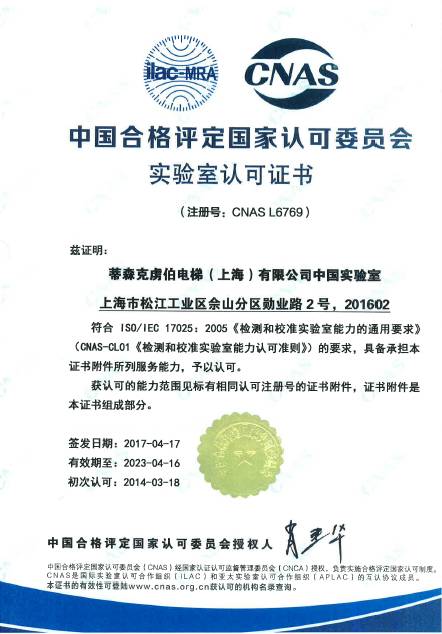 该实验室于2014年首次通过CNAS认证,并于2017年4月成功通过CNAS组织的换证复评审和扩项评审。CNAS认定是国际最权威的实验室认定之一,通过该认定意味着被认定方取得了多个国际互认协议集团机构成员的认可,所做出的检测结果得到国际各权威机构的承认。目前,中国电梯行业内通过CNAS认可的实验室可谓是凤毛麟角。通过CNAS认定,一方面表明蒂森克虏伯电梯实验室具备了权威机构认可的试验能力;另一方面,也有利于实验室标准化运作,提升产品试验准确性,为产品研发、产品制造等提供有力的技术保障。