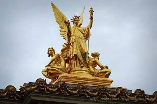 歌剧院顶上有两座金光灿灿到镀金青铜像