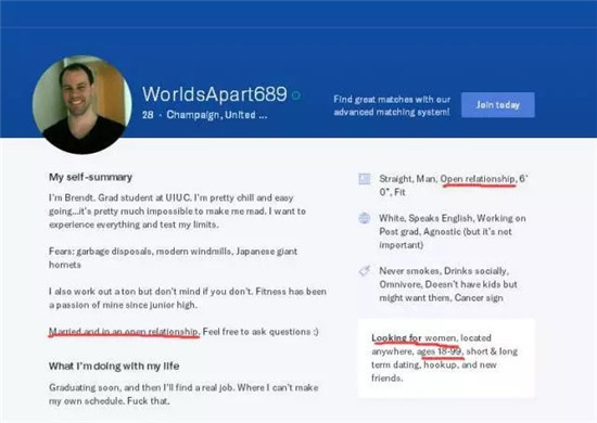 据美国《世界日报》报道,涉嫌绑架香槟伊大中国女学者的克利斯汀森(BrendtChristensen)虽然已婚,但直到6月30日被逮捕前,都还是知名的交友网站OKCupid的活跃用户。在网站上,他表示自己已婚但为开放关系(夫妻双方不限制对方与其他人有性关系),因此可以接受多重伴侣。此外,从其资料中也可以看出,克利斯汀森对日本文化颇为钟情。