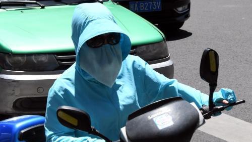 7月10日,福建省福州市民出行“全副武装”抵挡酷暑。