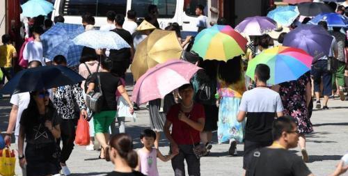 7月12日,厦门一景点游客们纷纷打起伞遮挡烈日。