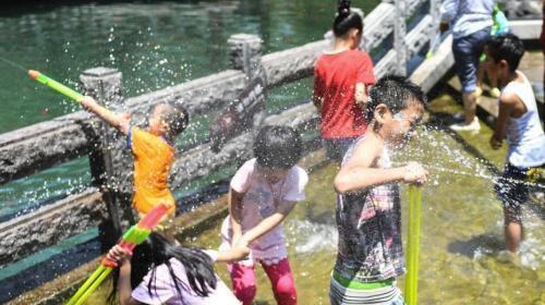 7月11日,几名儿童在山东济南“清泉石上流”池中戏水纳凉。