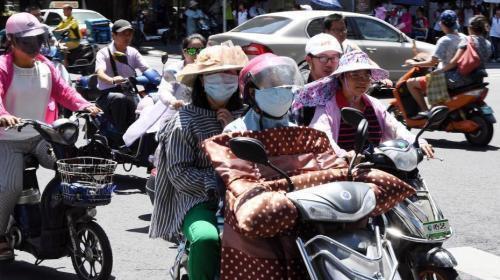 7月10日,福建省福州市民出行“全副武装”抵挡酷暑。