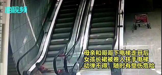 一名五六岁、身穿长裙的女孩,裙子不慎被卷进扶手电梯里,所幸被特警巡逻发现,马上上前抱起女孩并紧急关停电梯,避免意外的发生。