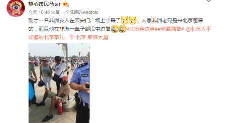 来中国的非洲大兄弟也受不了了。几天前,据微博网友“热心市民马sir”爆料,一名非洲友人在天安门广场上中暑了。该名非洲老兄是来北京避暑的,而且他在非洲一辈子都没中过暑……