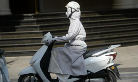 在越南北部气温飙升至40℃时,出门上班时只能全副武装,防高温暴晒。