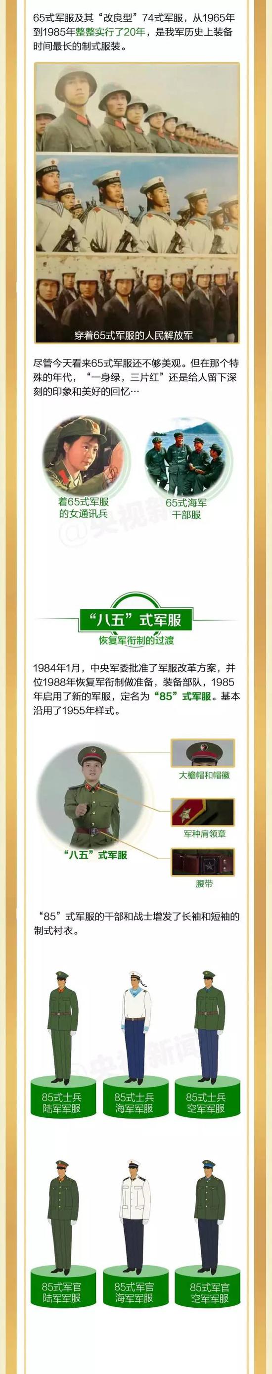 一个国家军队服装的变革和发展,既为国家经济实力所制约,也受民族文化和政治环境的影响。中国人民解放军军服发生了多次变化,经历了从单一制式到系列配套,越来越实用,越来越美观,越来越系列化。其演进过程如同一幅壮丽的历史画卷,既体现了整个时代审美观念的变化,也在某种程度上展示了中国人民军队的成长史和中国社会经济的发展史。
