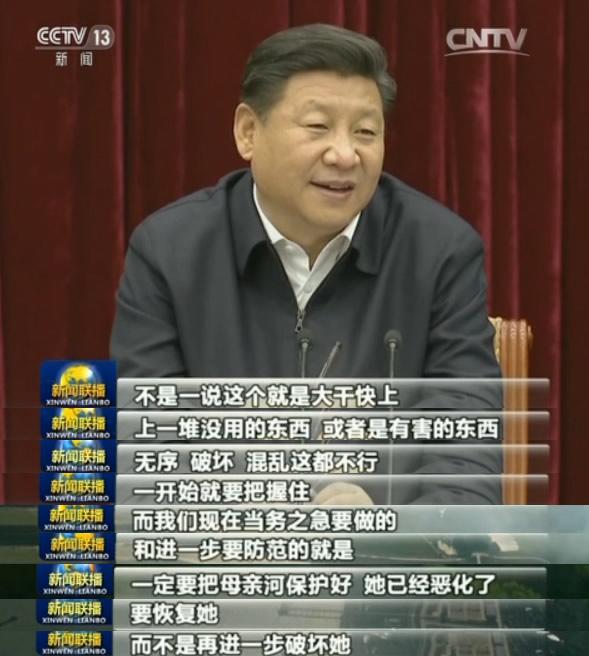 “不是一说这个就要大干快上,上一堆没用的东西,或者是有害的东西,无序、破坏、混乱这都不行,一开始就要把握住,而我们现在当务之急要做的和进一步要防范的就是,一定要把母亲河保护好,她已经恶化了,要恢复她,而不是再进一步的破坏她。”