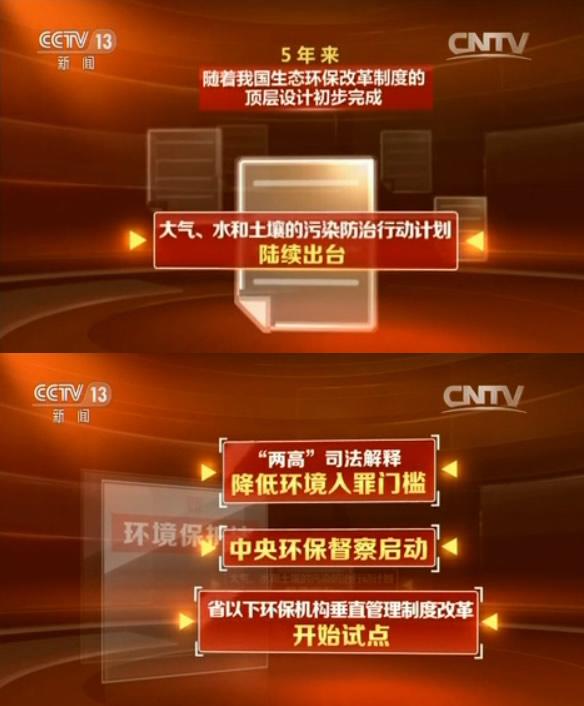 五年来,随着我国生态环保改革制度的顶层设计初步完成,大气、水和土壤的污染防治行动计划陆续出台,新《环境保护法》颁布施行,“两高”司法解释降低环境入罪门槛、中央环保督察启动、省以下环保机构垂直管理制度改革开始试点,各项关切民生的生态制度出台的密集程度前所未有。