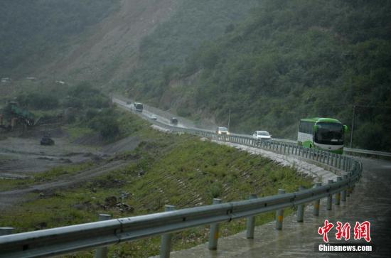 九寨沟震区最后一批游客安全转移。图为大客车载着游客冒雨撤离。