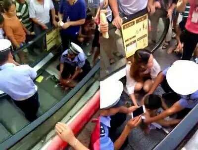 一名三岁左右的小男孩坐在一家超市的手扶电梯上嚎啕大哭,让人听了十分揪心。两名交警正在紧张地进行施救,电梯两边站满了围观群众。
