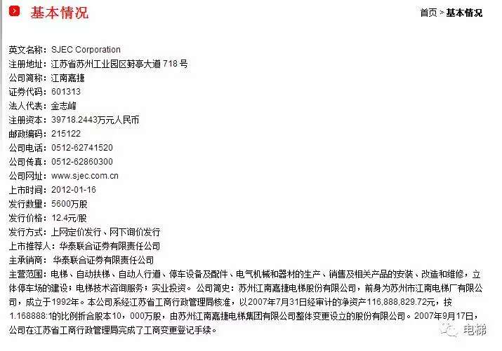 法人金志峰,2012年1月16日主板上市,发行数量5600万股,发行价格为12.4元/股(目前停牌价为8.79元/股),公司简史:苏州江南嘉捷电梯股份有限公司,前身为苏州市江南电梯厂有限公司,成立于1992年。本公司系经江苏省工商行政管理局核准,以2007年7月31日经审计的净资产116,888,829.72元,按1.168888:1的比例折合股本10,000万股,由苏州江南嘉捷电梯集团有限公司整体变更设立的股份有限公司。2007年9月17日,公司在江苏省工商行政管理局完成了工商变更登记手续。