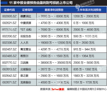 《中国经济周刊》记者梳理出11家业绩从盈利修正为亏损的公司,全是中小板企业。