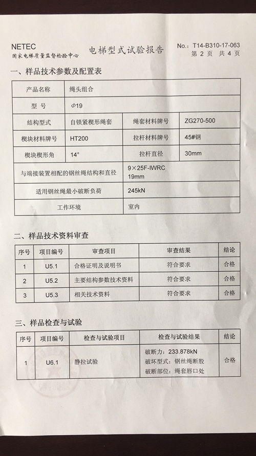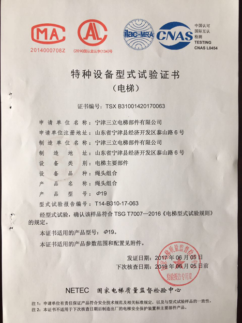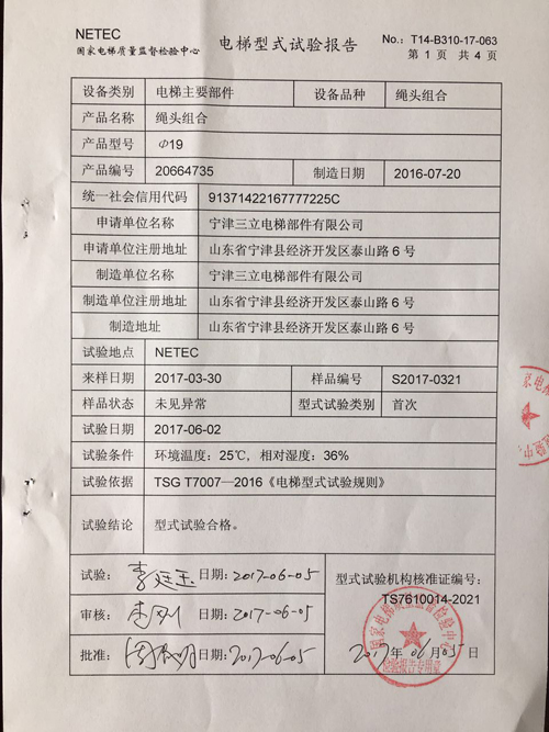 近期,宁津三立电梯部件有限公司Φ19型号的绳头组合通过了特种设备试验。