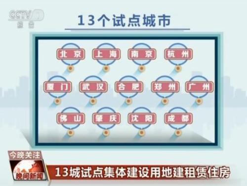 13个试点城市为北京、上海、南京、杭州、厦门、武汉、合肥、郑州、广州、佛山、肇庆、沈阳、成都,预计在2020年底试点结束前,探索出一批可复制可推广的集体建设用地建租赁住房改革成果。