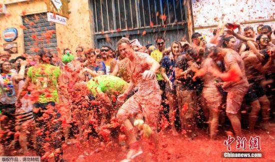 资料图:当地时间8月30日,西班牙巴伦西亚布尼奥尔镇举办一年一度的番茄大战,数万民众相互扔番茄狂欢。