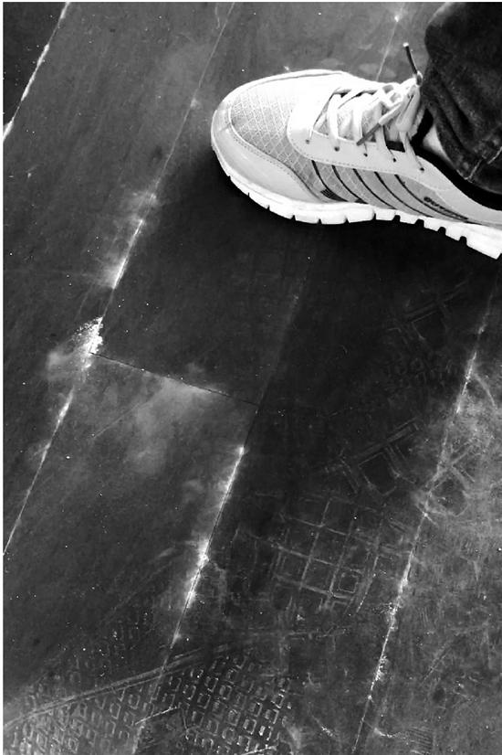 小林表示,富力十号院精装修问题最严重的就是地板冒灰。钱报记者在小林家中发现,当在地板上踩踏的时候,地板间的缝隙里就会有白灰喷涌而出。小林说,加入业主群的200多户人家,几乎家家都有这个问题。
