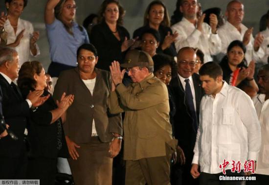 资料图:当地时间2016年11月29日,古巴哈瓦那,民众出席在古巴革命广场上举行的大规模追悼活动,悼念去世的古巴前领导人菲德尔·卡斯特罗。图为古巴领导人劳尔·卡斯特罗现身活动现场。