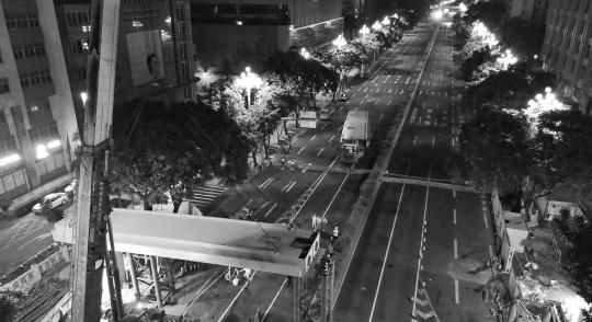昨日凌晨,广州市福今路新天桥开始安装,预计本月16日投入使用。旧人行天桥被称为广州“最悲催的天桥”,仅媒体报道11年来这两个桥墩就被撞了7次。为了消除交通隐患,一个月前天桥被成功拆除。