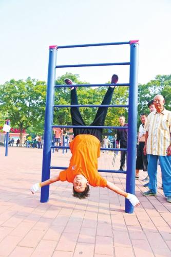 陈玉玲老人个子不高,身材有些瘦小,上穿红色短袖T恤,下穿黑色健美裤,脚穿运动鞋。她似乎对健身区内的每一台健身器都玩得十分娴熟,单杠、双杠、高低杠,她轮番在上面秀自己的绝技。为避免手上出汗打滑,她练功时总戴一双白手套。看着她在攀爬杆上练习倒挂金钩、一字劈腿,在围栏前练金鸡独立、大鹏展翅,而且气不长喘,神情自若,在一旁观看的年轻人连连感叹:“佩服!佩服!”老人们更是赞不绝口。