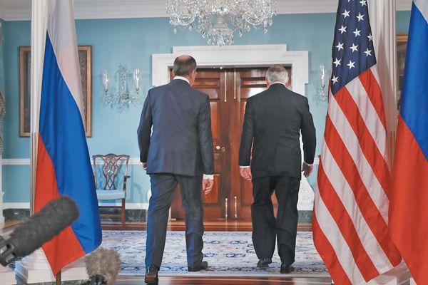 俄罗斯外长拉夫罗夫和美国国务卿蒂勒森今年5月会见记者后并肩走出会议大厅。