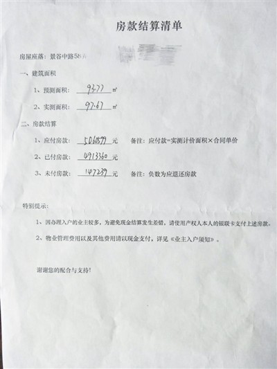 原来39栋、40栋的业主在办理入住前都收到了一张房款结算清单,这份清单以实测面积和预测面积存在出入为由,让业主补缴相应的差额款。面积4-6平方米左右,金额15万-22万不等。