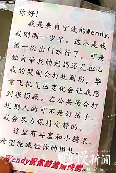 让空姐陈女士感动的是,这位妈妈送的小礼物,里面是耳塞和两颗糖果,礼物虽轻,但最动人的是礼物袋背面打印的一段话:“你好!我是来自宁波的Wendy,我刚刚一岁半。这不是我第一次出门旅行了,可是独自带我的妈妈还是担心我的哭闹会打扰到您,毕竟飞机气压变化会让我感到很烦躁。在公共场合打扰别人的可不是好孩子,我会尽力保持安静的。这里有耳塞和小糖果,希望能减轻你的困扰。Wendy祝你旅途愉快哟。”