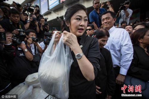 当地时间2016年11月11日,泰国曼谷,因米价下跌农民大受打击,泰国前总理英拉现身街头亲自帮助米农卖大米,声援米农。图片来源:视觉中国。