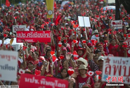 当地时间2014年5月11日,泰国曼谷,泰国“红衫军”高举英拉和他信的头像举行大规模集会,声援政府并抗议宪法法院等独立机构的“不公”。
