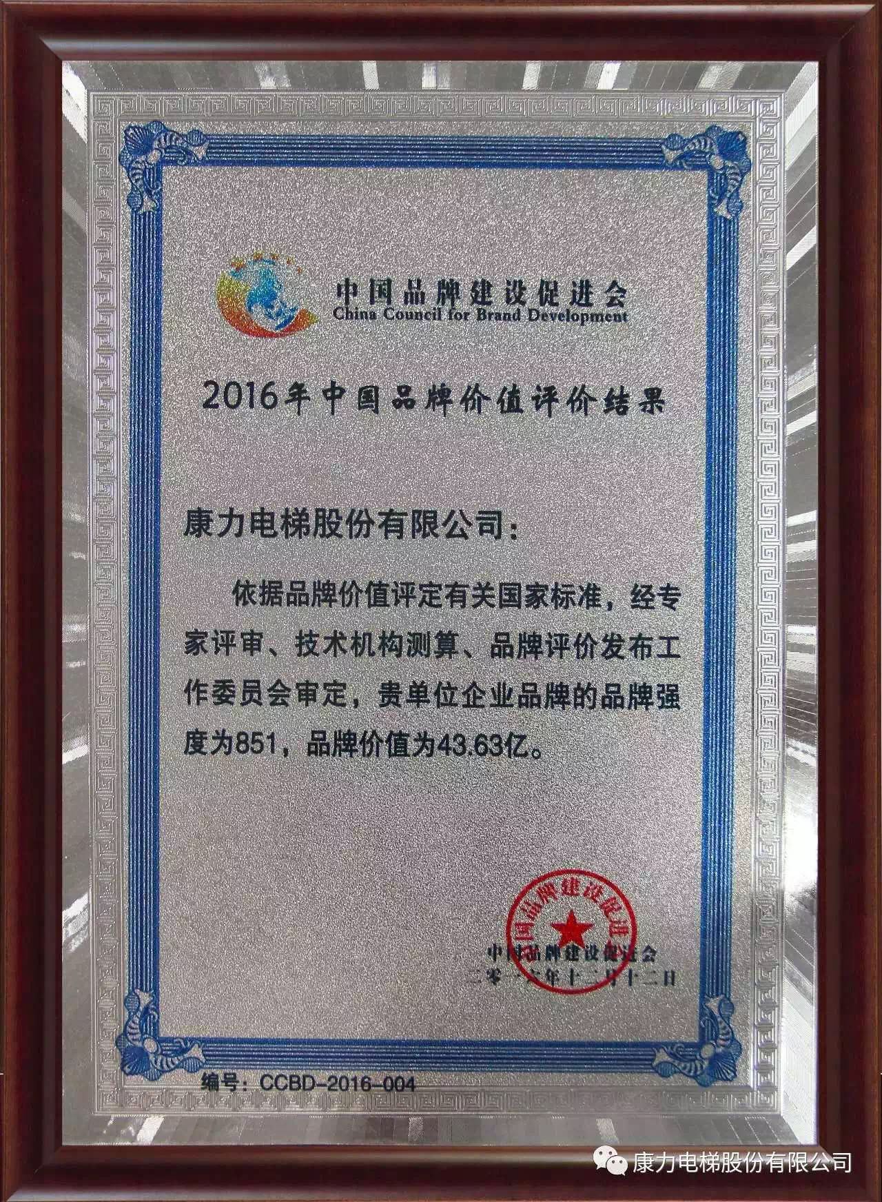 2016年,康力电梯以851品牌强度和43.63亿元品牌价值,携手中国中车、潍柴动力等领军企业荣登“中国品牌价值评价榜”。