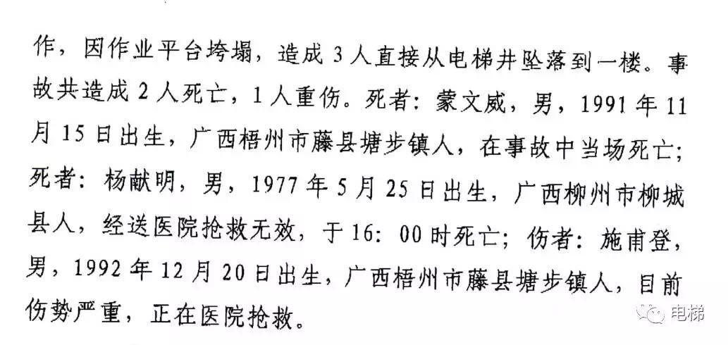 事故初步原因就是电梯安装作业平台的垮塌,造成了3名电梯安装工从4楼坠落。