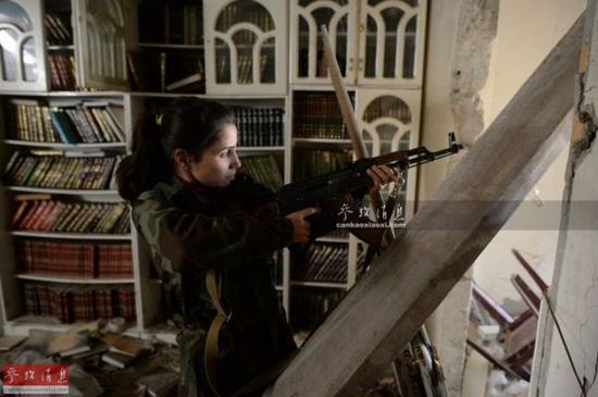 资料图:叙政府军女兵,隐藏在民房中进行警戒。
