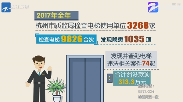 记者从发布会上了解到2017年全年,杭州市质监局检查电梯使用单位3268家,检查电梯9826台次,发现隐患1035项。期间,发现并查处电梯违法相关案件74起,合计罚没款项313.3万元。