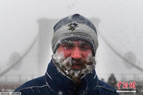资料图:纽约布鲁克林大桥上,一名行人行走在漫天暴雪中,脸上布满冰碴。