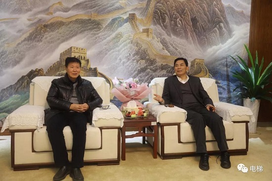 ▲恒达富士电梯董事长钱江明与佳源集团董事长沈玉兴在贵宾室会谈相关合作事宜