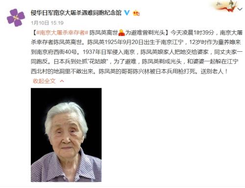 中新网1月11日电据侵华日军南京大屠杀遇难同胞纪念馆官方微博消息,1月10日凌晨1时39分,南京大屠杀幸存者陈凤英离世。