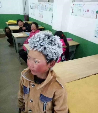 1月8日早晨,“冰花男孩”穿着一件不太厚的外衣走进教室,由于天气太冷,一路赶来上学的他,头发、睫毛上沾满了冰霜,脸蛋也冻得通红;一双脏脏的、红肿的小手已经起了冻疮。他站在教室里,萌萌的样子逗得同学们哈哈大笑。老师拍下了这一瞬间,并把照片发给了校长。