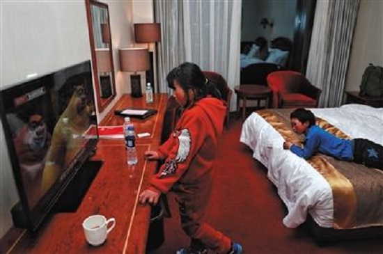 昨日,在入住的宾馆房间内,王福满和姐姐被电视里的动画片节目吸引。新京报记者彭子洋摄