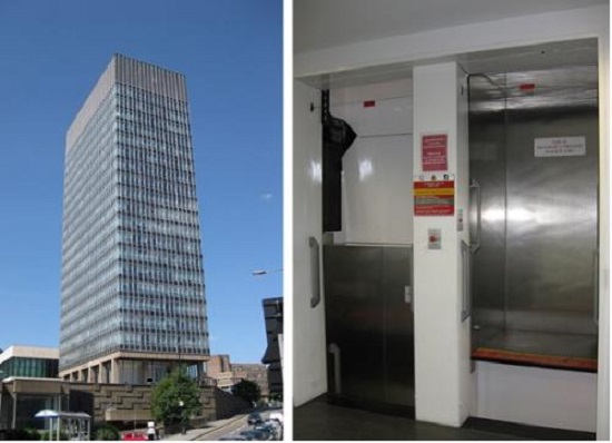 在英国谢菲尔德大学,有台连续运行,10余秒就有一电梯轿厢到达层站接送乘客的电梯,不仅运行时不停靠,还没有门。乘客只要看准时机“上蹿下跳”,就能以最短时间到达目标楼层。
