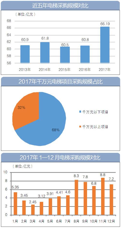 据《政府采购信息报》记者不完全统计,2017年,全国通过公开招标完成的电梯采购项目总金额逾66亿元,相比2016年的60.8亿元,增长近6亿元。