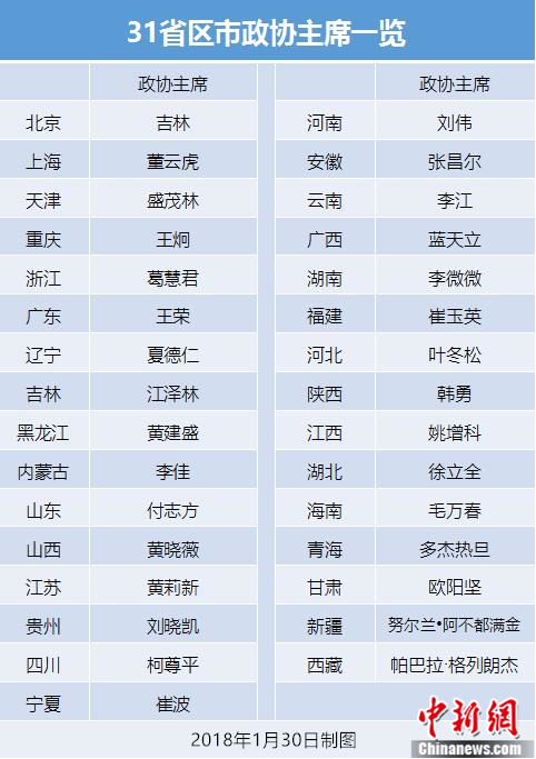 中新网客户端北京1月31日电(记者阚枫)目前,2018年省级地方两会正陆续闭幕,截至30日,全国31省份省级政协领导班子全部完成换届。记者统计,8个省份的省级政协主席由上一届连任,其余23个省份均迎来新任省级政协一把手。
