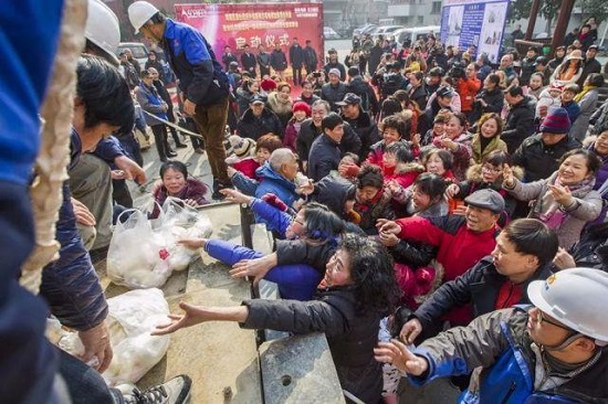 2月2日上午9点,宁波海曙区白云街道安丰社区三鼎坊169弄9号居民楼前,小区居民自发载歌载舞,庆祝海曙首部电梯在自家小区启动吊装。
