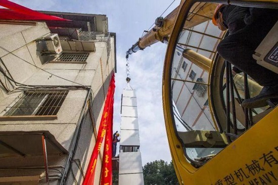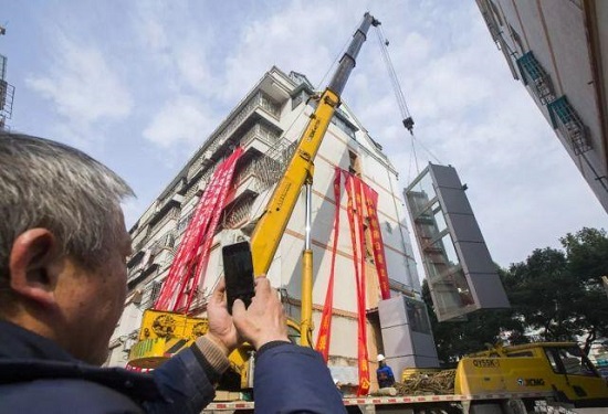 据介绍,这部电梯由于采用装配式,是海曙区第一部加装电梯,也是全市第一部装配式电梯,完成吊装后,预计再过1周电梯就可以试运行。