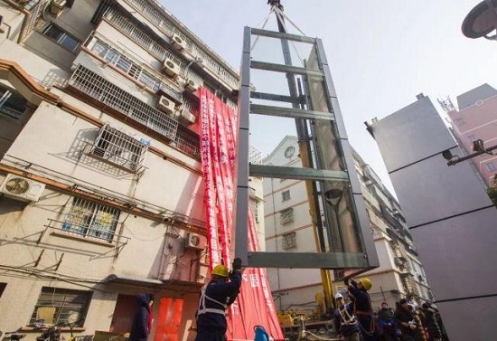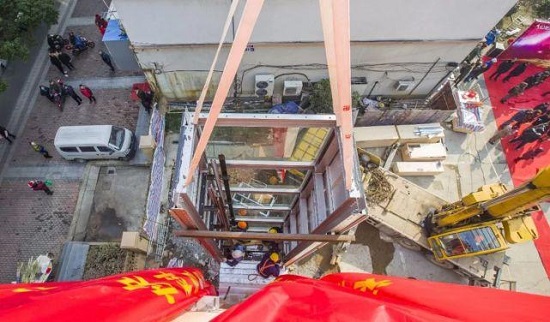 电梯生产厂家快科电梯的相关负责人介绍说,三鼎坊这部电梯是带钢结构一体化积木式电梯。它的特点是,占地面积小,不足3平方米,仅为传统电梯的三分之一;九成以上的电梯安装工作在工厂完内,现场安装简便,扰民时间短,质量有保障。